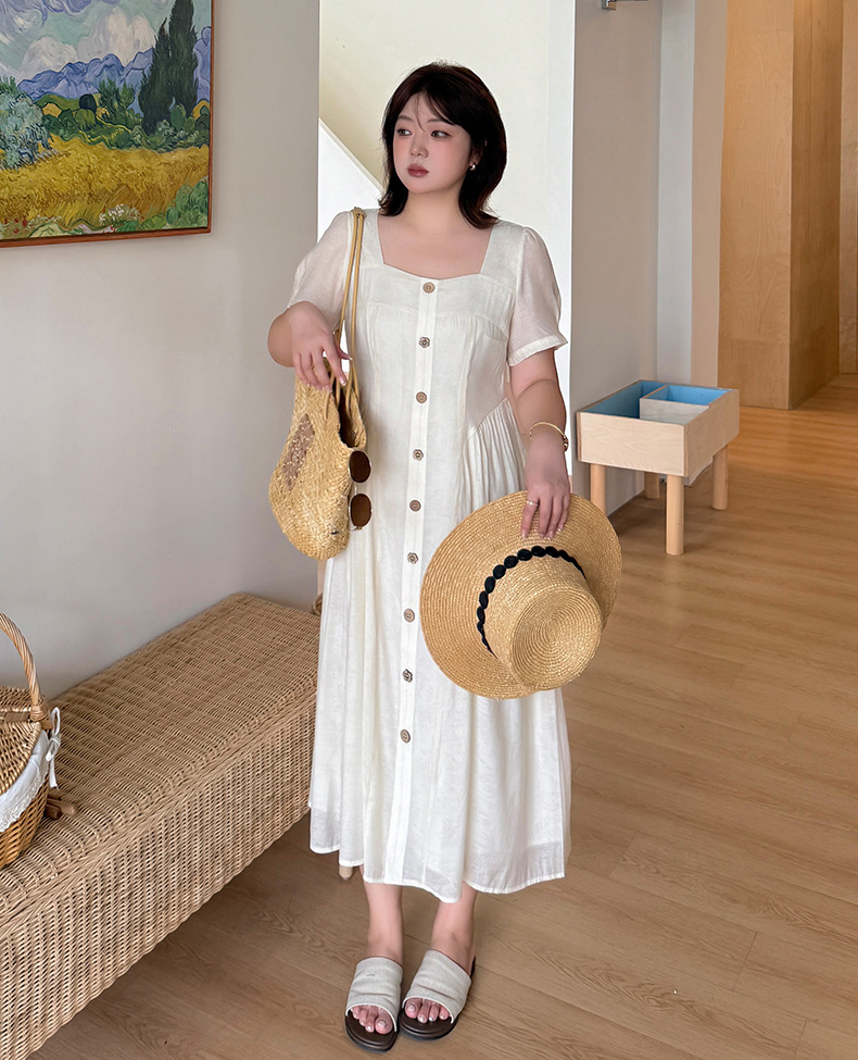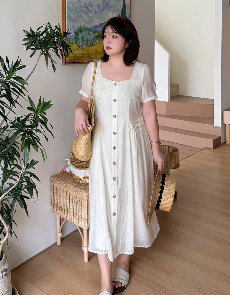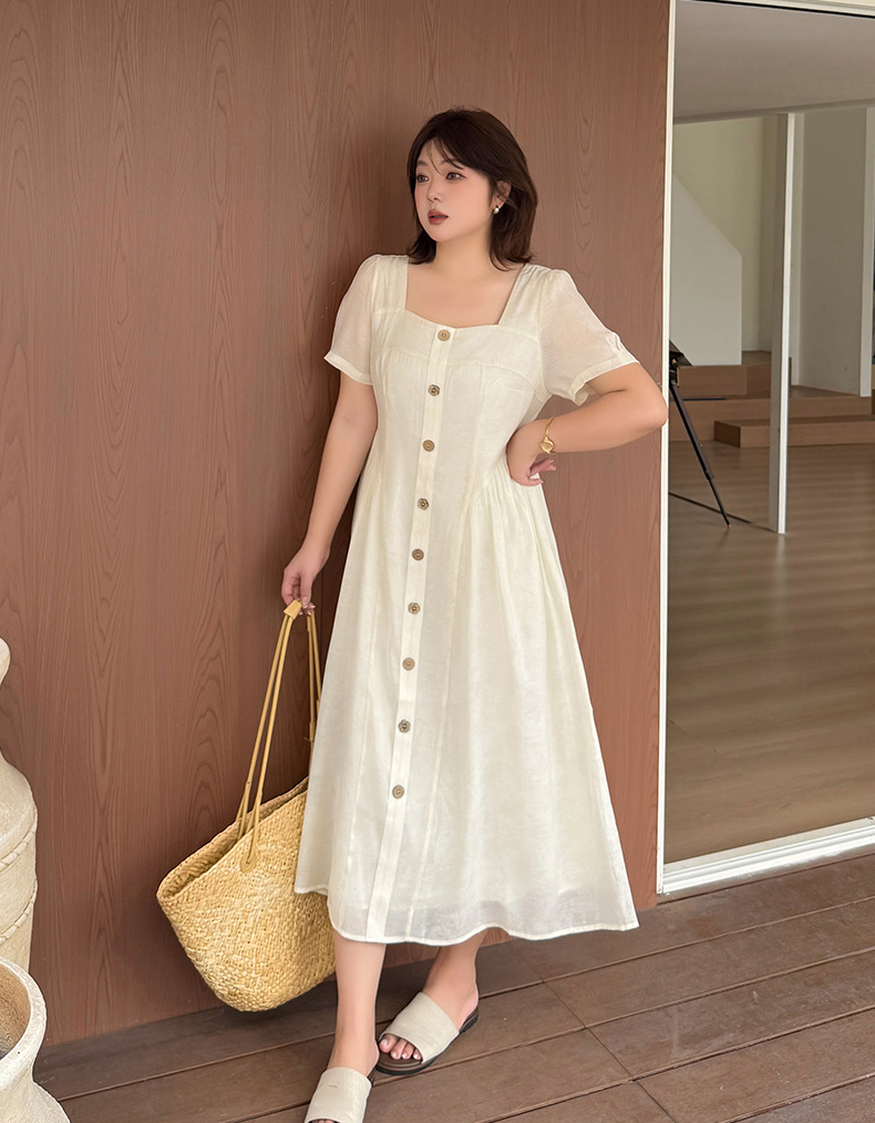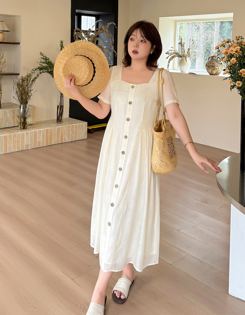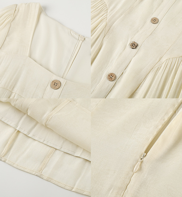 ヨーロッパの宮廷スタイルをベースにした、レトロな雰囲気のワンピースです。ゆったりと着られるのに、もたつかずすっきり見える絶妙なシルエットが魅力です。普段のお出かけから通勤、リゾートまで幅広いシーンに対応します。スクエアネックが顔まわりをきれいに見せ、ウエストの切り替えラインが縦のラインを強調してスタイルアップ効果を発揮します。ウエスト両サイドのタックが細見えを演出し、ほどよいゆとりでさまざまな体型の方にお召しいただけます。フロントの木目調ボタンは飾りで、全体のカラーに自然に馴染むデザイン。脱ぎ着は後ろの隠しファスナーで行います。裏地付きで、テンセル素材の生地は軽くて柔らかくドレープ感があり、肌触りも抜群。通気性に優れ、夏でも快適に過ごせます。フロントには丸ボタンと花模様ボタンが交互に並び、さりげなくアクセントを添えています。