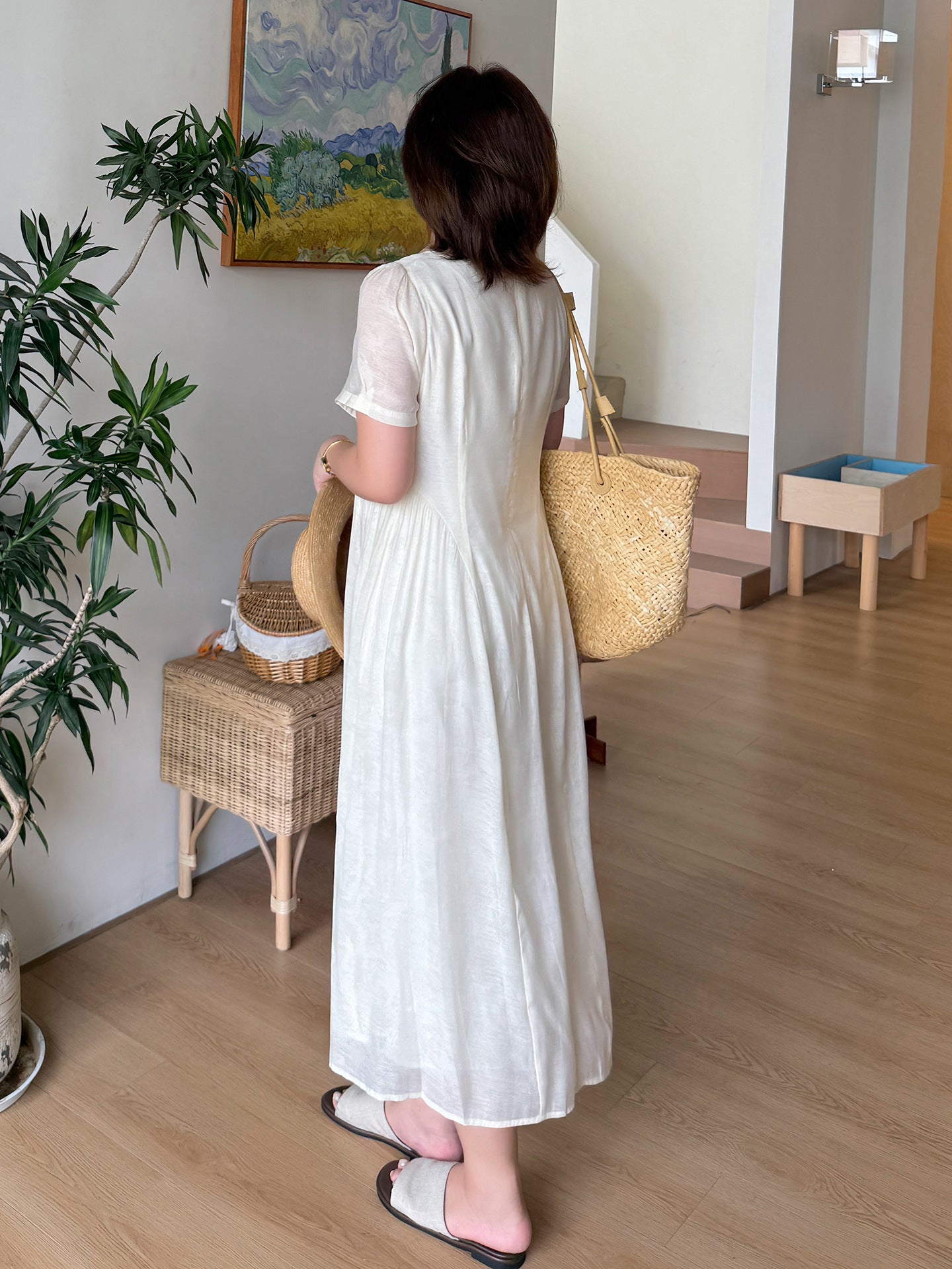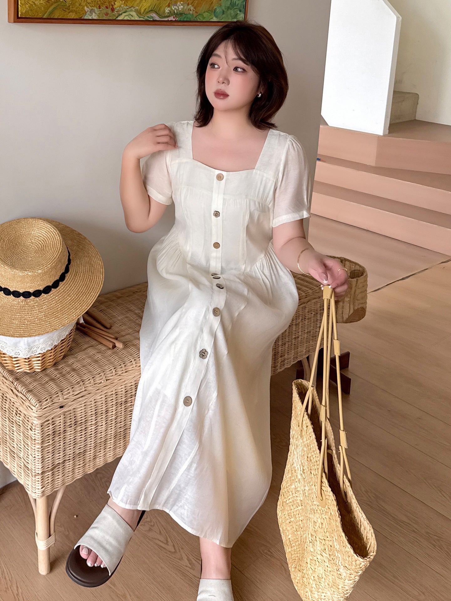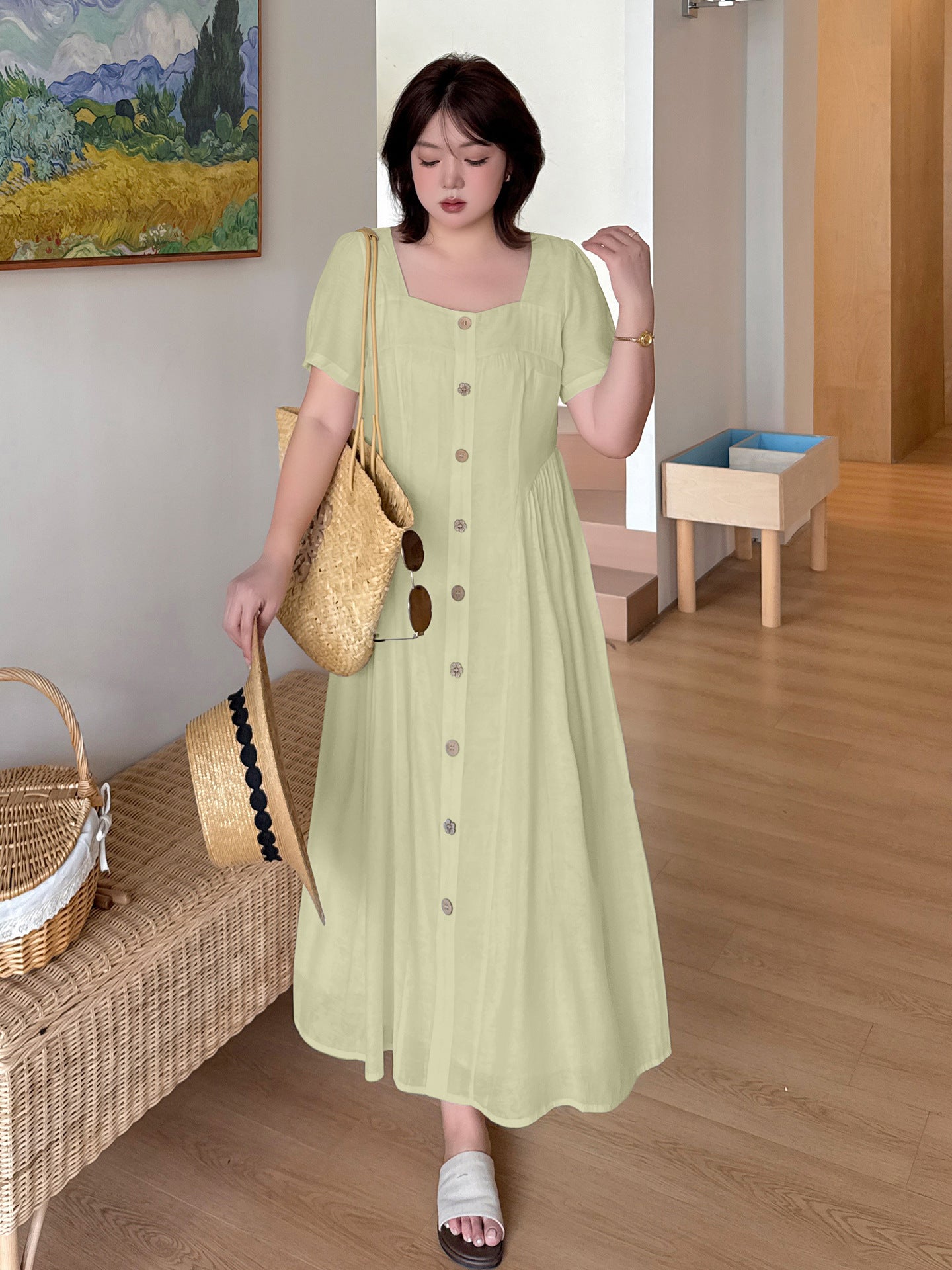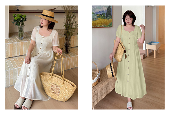 ヨーロッパの宮廷スタイルをベースにした、レトロな雰囲気のワンピースです。ゆったりと着られるのに、もたつかずすっきり見える絶妙なシルエットが魅力です。普段のお出かけから通勤、リゾートまで幅広いシーンに対応します。スクエアネックが顔まわりをきれいに見せ、ウエストの切り替えラインが縦のラインを強調してスタイルアップ効果を発揮します。ウエスト両サイドのタックが細見えを演出し、ほどよいゆとりでさまざまな体型の方にお召しいただけます。フロントの木目調ボタンは飾りで、全体のカラーに自然に馴染むデザイン。脱ぎ着は後ろの隠しファスナーで行います。裏地付きで、テンセル素材の生地は軽くて柔らかくドレープ感があり、肌触りも抜群。通気性に優れ、夏でも快適に過ごせます。フロントには丸ボタンと花模様ボタンが交互に並び、さりげなくアクセントを添えています。